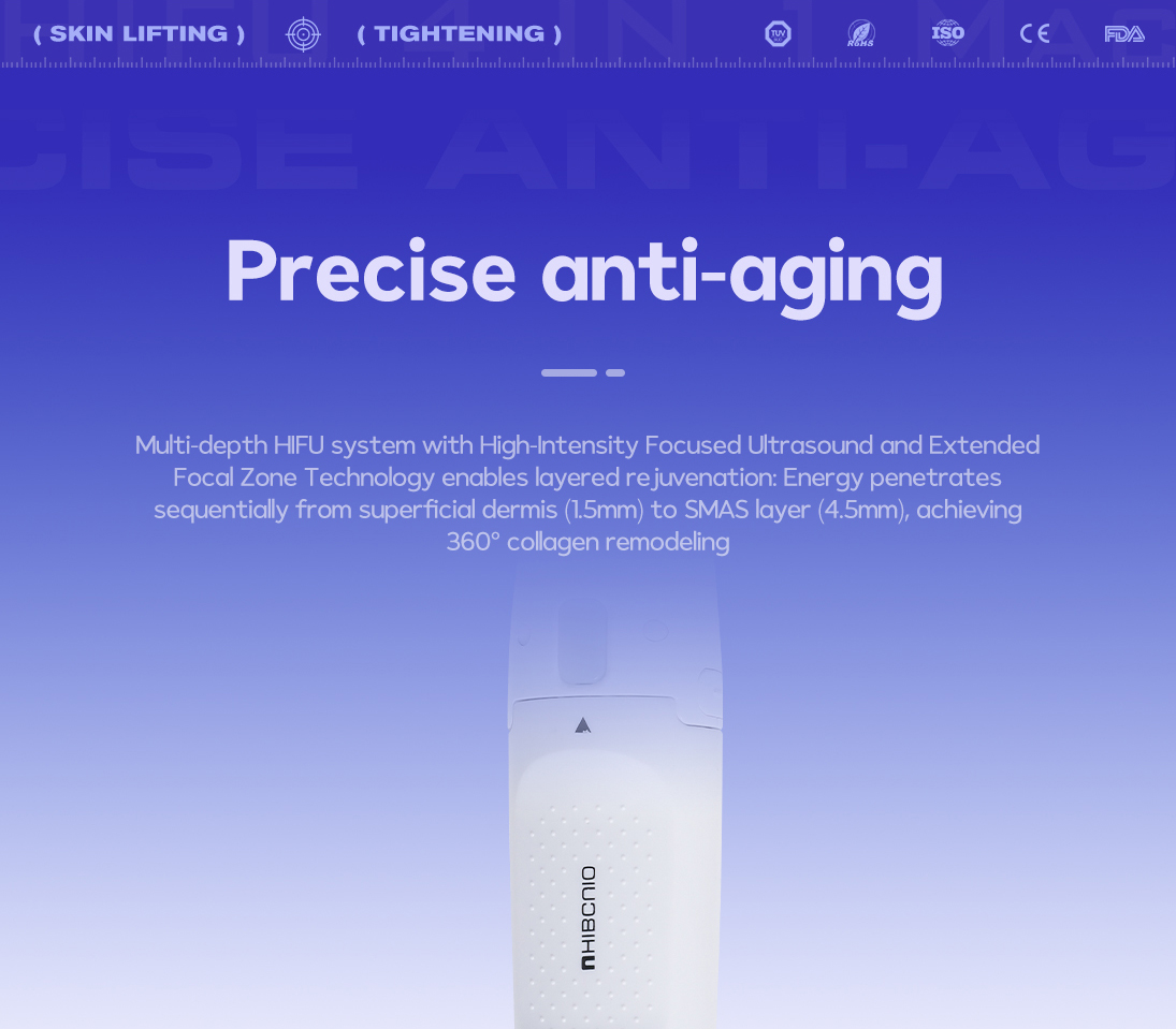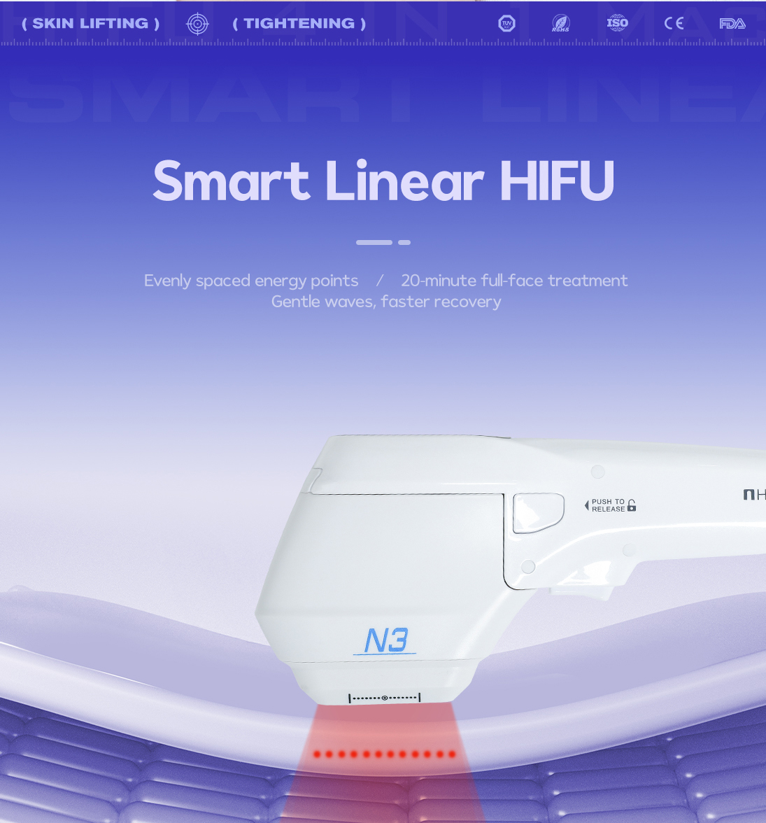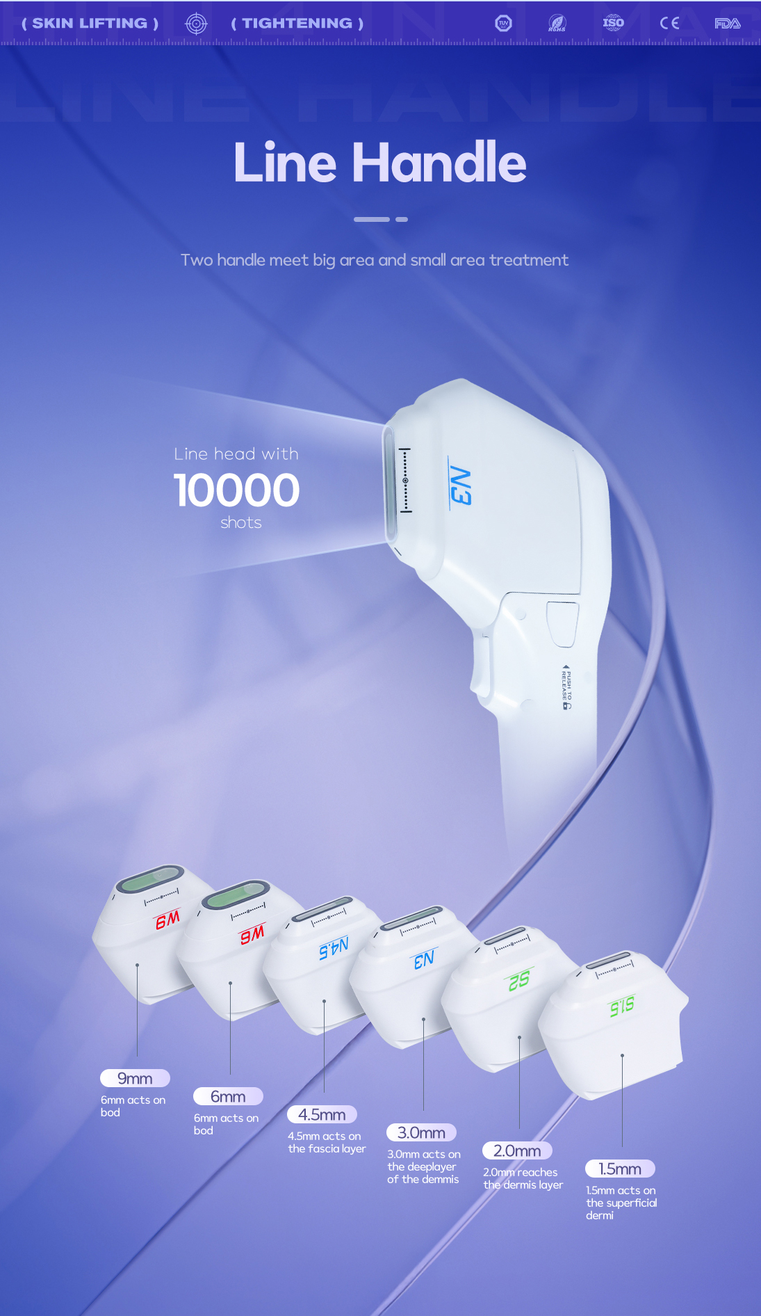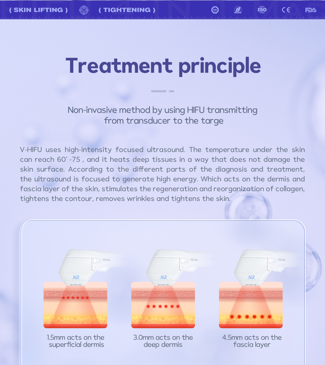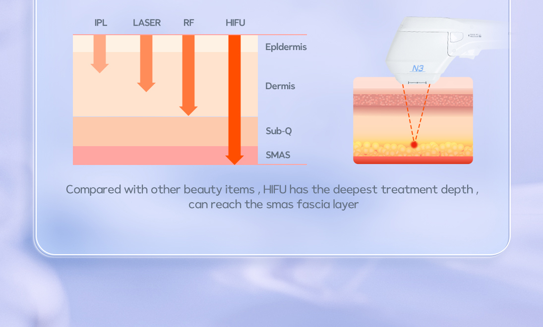 HIFU precisely positions the ultrasonic energy in the subcutaneous 4.5mm fascia layer, to achieve the best effect of shaping, lifting and firming. It acts on the collagen layer of 3mm under the skin, to rejuvenate the collagen, and achieve aging problems such as skin elasticity, whitening, wrinkle removal, and fine pores. At the same time, because the energy is swept across the epidermis, also the skin can be lifted, tightened,contoured in a second.