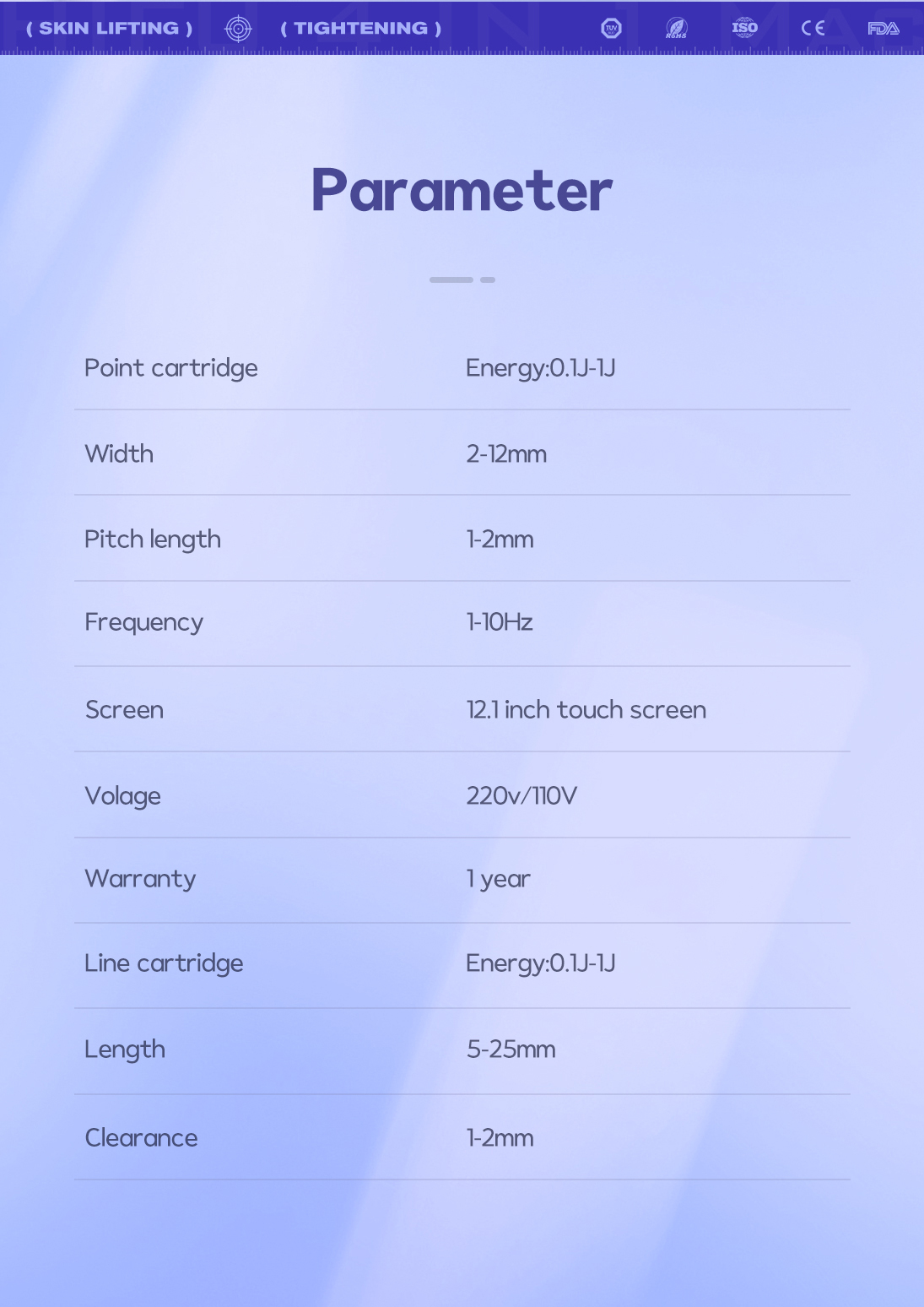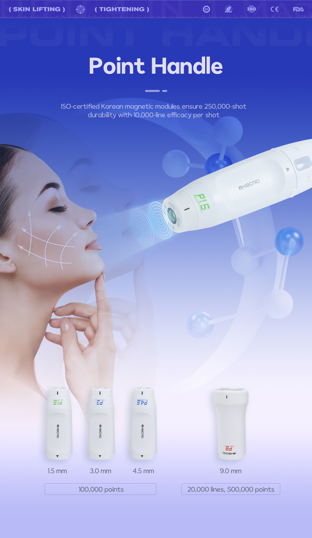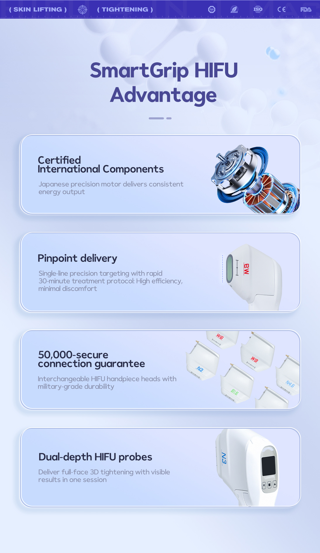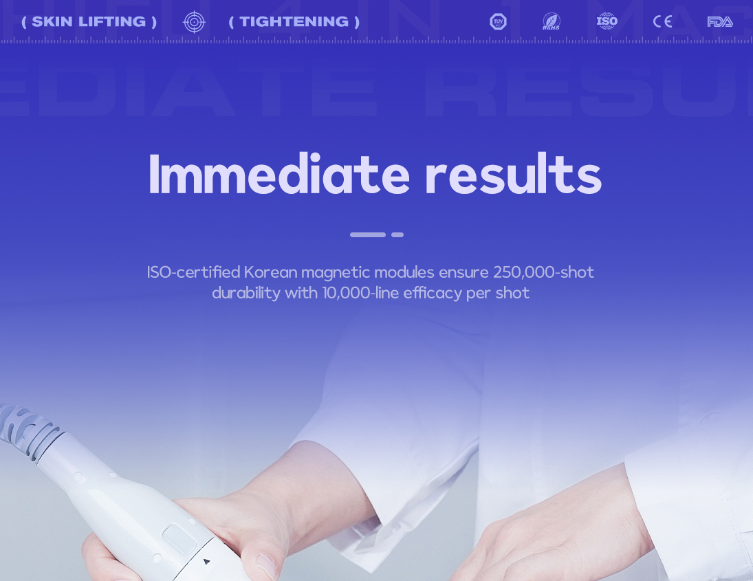 HIFU precisely positions the ultrasonic energy in the subcutaneous 4.5mm fascia layer, to achieve the best effect of shaping, lifting and firming. It acts on the collagen layer of 3mm under the skin, to rejuvenate the collagen, and achieve aging problems such as skin elasticity, whitening, wrinkle removal, and fine pores. At the same time, because the energy is swept across the epidermis, also the skin can be lifted, tightened,contoured in a second.