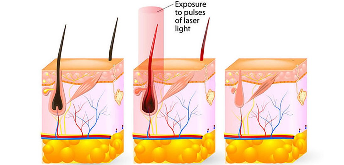 During the laser hair removal treatment, light passes through the skin and is absorbed by the melanin in the hair shaft. This absopption raises the temperature of the hair follicle and thermally destroys the cells responsible for regrowth.