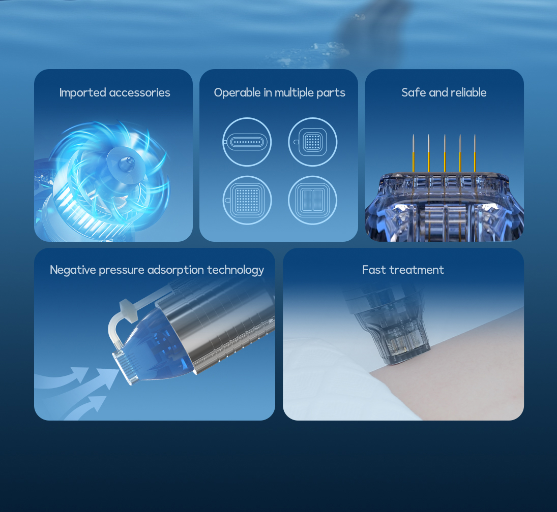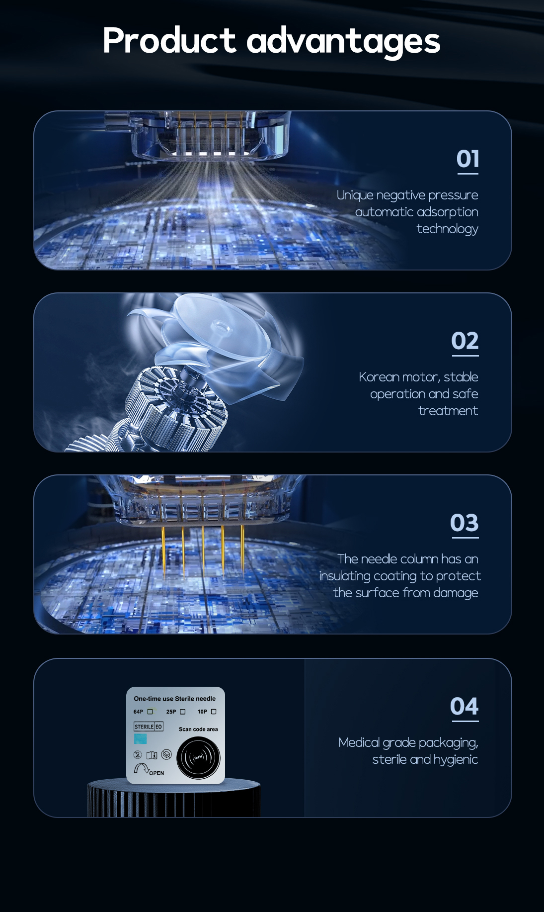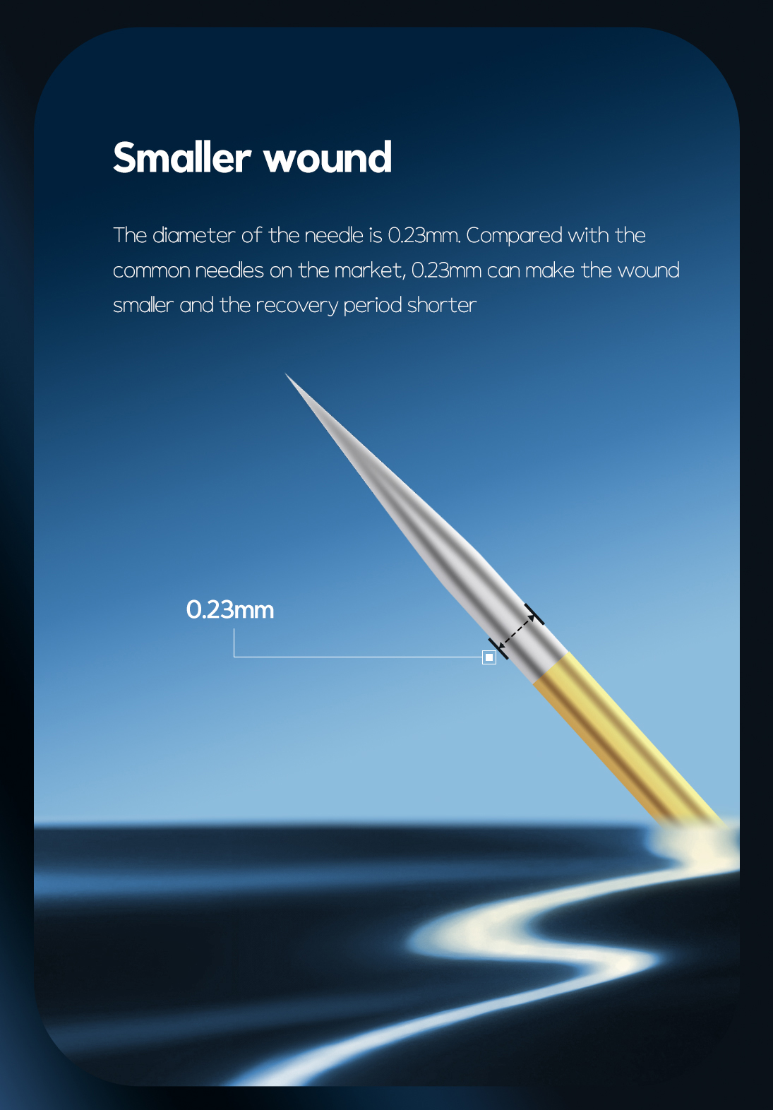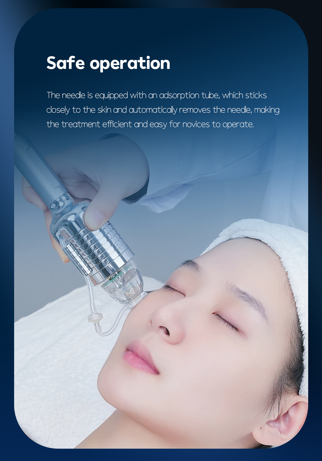 Adopting negative pressure adsorption technology,first adsorb the skin, and then apply the microneedle treatment,Ensure that the depth of each needle into the skin is the same and the energy is even,Tighten the skin to avoid leakage of medicine and automatically eject the needle,The needles are packaged with sterile nitrogen to ensure the hygiene and safety of each treatment.