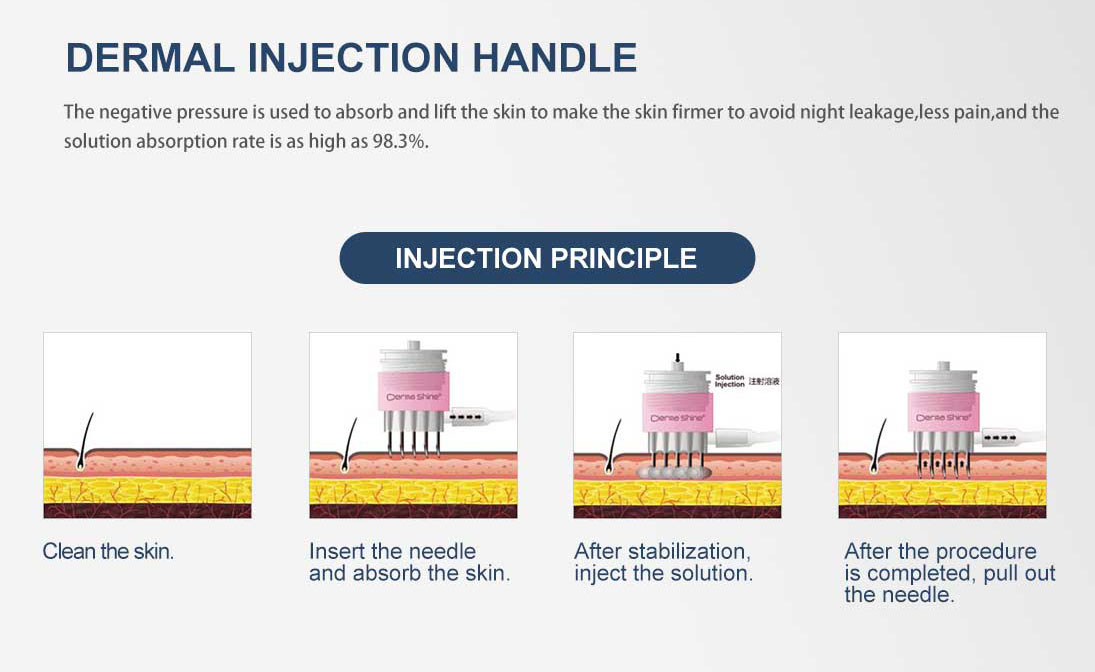 South Korea’s Der Mashine’s fourth-generation water light instrument has three hand tools, namely water light hand tool, microneedle hand tool, and cold compress device. Among them, water light hand tool uses 9-needle and 13-needle needles, which greatly improves the instrument’s performance. Stability and time efficiency, it can very accurately control the amount of medicine, reducing the user’s pain; the new microneedle hand tool uses 10-needle, 25-needle and 64-needle needles to accurately act on the radio frequency energy at different depths of target tissue It stimulates and induces the reorganization and regeneration of collagen, and at the same time the skin tissue will be tightened, prompting the skin to quickly skin to a young and healthy state, so as to achieve the effects of wrinkle removal, skin tightening and skin aging.